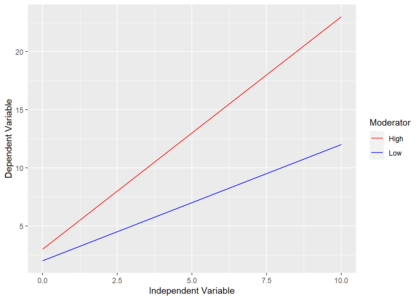 xyline <- function(x, a, b) {a + b * x}There are some R packages that help researchers to plot moderation (interaction) effects: The linear relations between x (independent variable / predictor) and y (dependent variable / outcome variable) for two or more levels of w (moderator). For example, I have been using visreg for multiple regression models fitted by lm() for a long time. It is simple to use and supports both base R graphics and ggplot2. stdmod, which I maintained, also has the function plotmod for plotting simple effects in moderated regression. For structural equation modelling, semTools can be used to plot interaction for latent variables using plotProbe(). plotProbe() can also be used to on observed variables using this workaround.